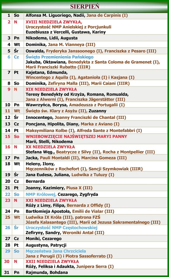 25 sierpnia - Ludwika IX Króla (III), patrona III zakonu, Józefa Kalasantego (III), Marii od Jezusa Sakramentalnego (III)